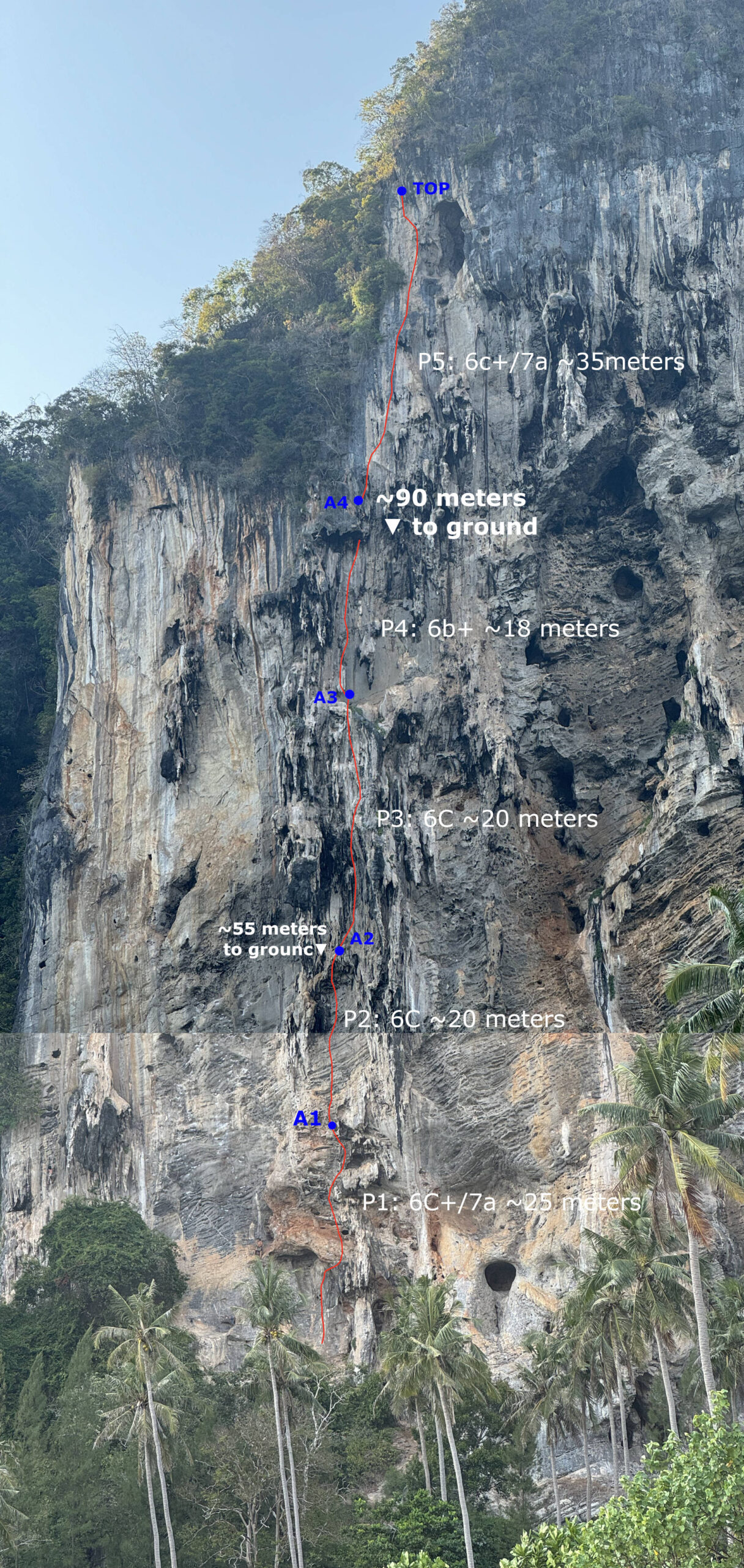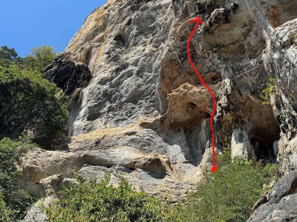 Pitch 3 (6c): The third pitch is relatively long, with difficulties evenly distributed throughout its length.