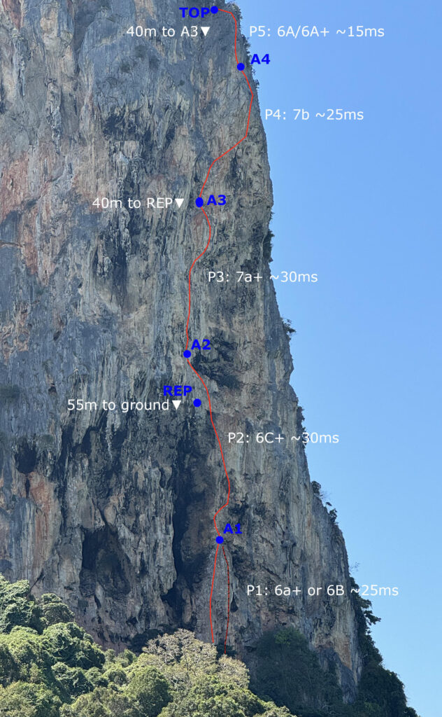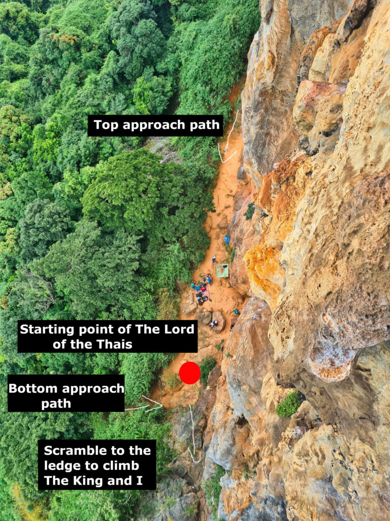 To get to the route, head to Railey West beach and then walk along the beach to its very southern end (what3words location ///twister.suspecting.banally). Right at the end of the beach, there’s a narrow trail leading uphill all the way to the massive face of Wee’s Present Wall. Upon reaching it, turn right and follow a sketchy path through trees and boulders to the base of Thaiwand Wall. The path splits a bunch, and ultimately you can approach the base of Thaiwand Wall either from the top or bottom. The start of Lord of The Thais is almost opposite the lower approach path.