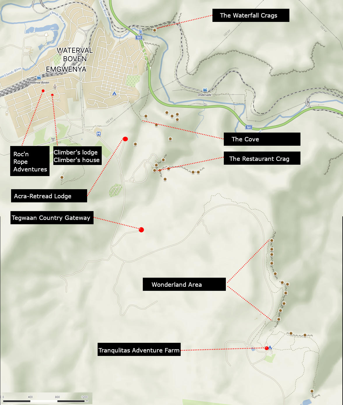 In Waterval Boven, there are several accommodation options that can affect the ease of access to the various groups of climbing sectors, depending on whether you have a car and its type.
